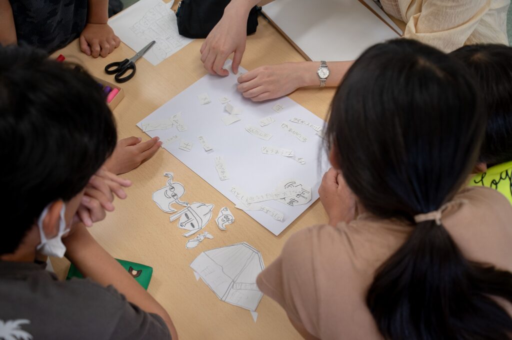 言葉の収穫では、会場の図書室から出て、その階の廊下をぐるりと散策。見つけたもの、感じたものを1枚の紙に書き取っていきました。ワークショップ後半では、5人1グループとなり、集めた言葉を切り取りつつ、他の子が集めた言葉も組み合わせて作品制作をしていきます。